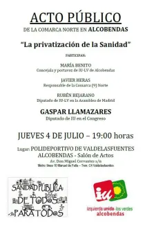 El pasado jueves 4 de julio los compañeros de IU Alcobendas realizaron un acto público en la ciudad deportiva de Valdelasfuentes en defensa de la sanidad pública, en dicho acto intervinieron: