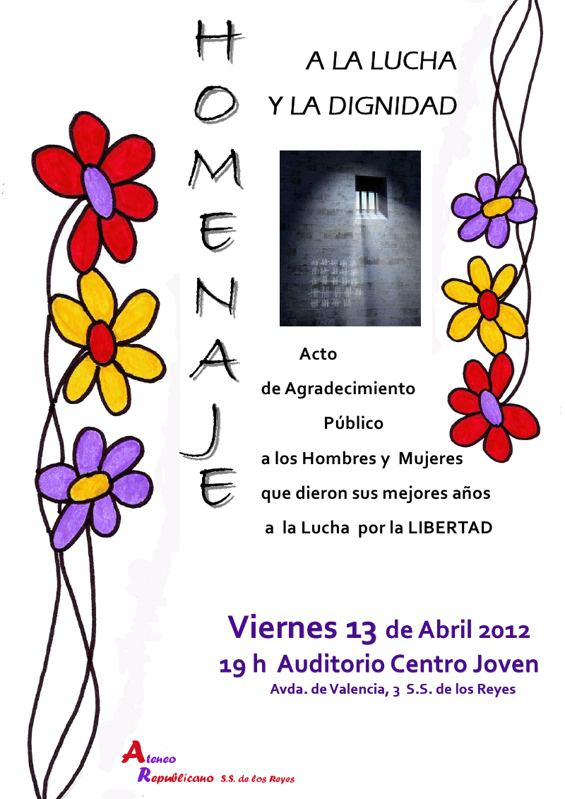 Desde el Ateneo Republicano de S.S. de los Reyes queremos poner en conocimiento, que el próximo 13 de Abril, viernes, vamos a celebrar un importante acto de agradecimiento, un HOMENAJE A LOS LUCHADOR@S POR LA LIBERTAD Y LA DEMOCRACIA.