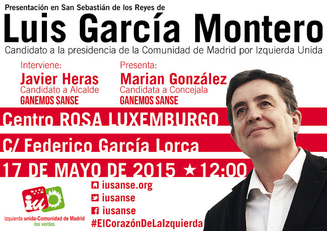 Este acto se engloba dentro de la campaña para las elecciones autonómicas para la Comunidad de Madrid en el que el candidato de Izquierda Unidad – Los Verdes presentará las propuestas programáticas con la certeza de representar los valores reales de la izquierda transformadora. El acto será presentado por Mª Ángeles González, directora del IES Juan de Mairena y candidata a concejala por Ganemos Sanse y contará con la intervención de Javier Heras, candidato a la alcaldía por Ganemos Sanse.