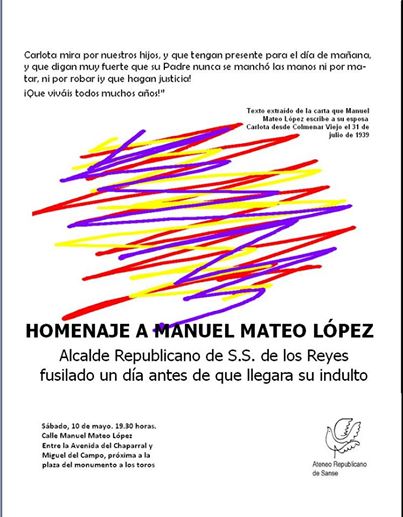 Y lo hacemos porque el Ayuntamiento, a iniciativa de Izquierda Unida, ha aprobado una declaración institucional para que el Ateneo Republicano pueda rendir el homenaje que merece Manuel Mateo López, un trabajador que quiso servir a su pueblo, asumiendo las tareas de Alcalde, en los difíciles tiempos de la República, motivo por el que fue encarcelado y fusilado.