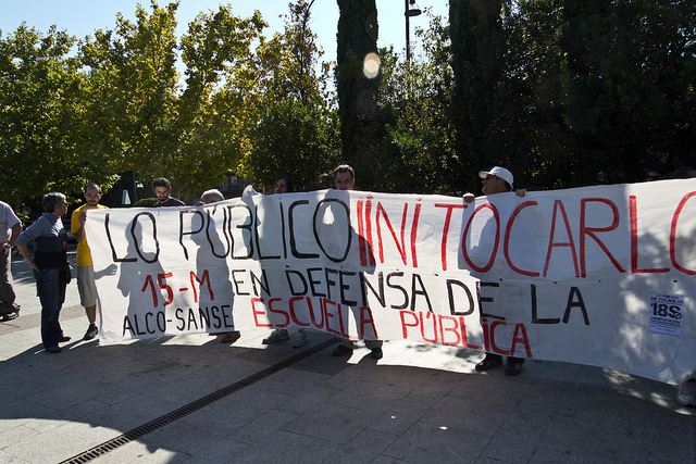 El pasado viernes 14 de octubre un grupo de personas pertenecientes a la asamblea local del 15-M se encontraban en la Plaza de la Fuente de San Sebastián de los Reyes con la intención de pintar una pancarta para la manifestación del día 16 en defensa de la educación pública.