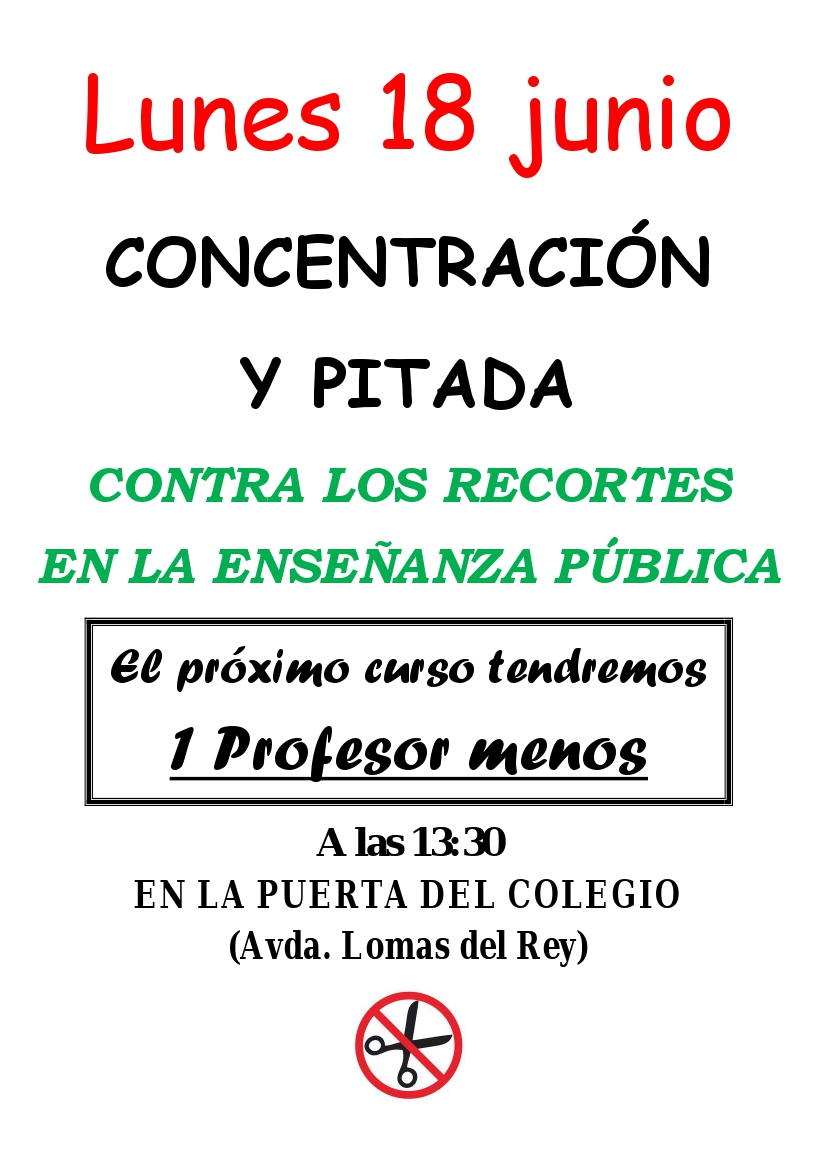 Los recortes serán efectivos para el próximo curso en todos los colegios e institutos de la CAM pero poco a poco nos vamos enterando de la subida de los comedores escolares, de las escasas becas de libros para el próximo año, de hecho todavía no hay ni convocatoria y por si fuera poco a la falta de profesorado le añaden la no cobertura de las bajas por jubilación, que no es un hecho aislado ya que esto durante el próximo curso escolar, se dará en algunos colegios e institutos de la Comunidad