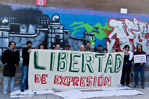 Hoy los concejales de IU e II de San Sebastián de los reyes han procedido a pintar una pancarta con el lema "Libertad de Expresión" en la plaza de la fuente, donde el pasado sábado 15 unos compañeros de la asamblea del 15M de Alcobendas y Sanse fueron desalojados por llevar a cabo idéntica actividad preparando la manifestación del día 16 de octubre contra los recortes en educación.