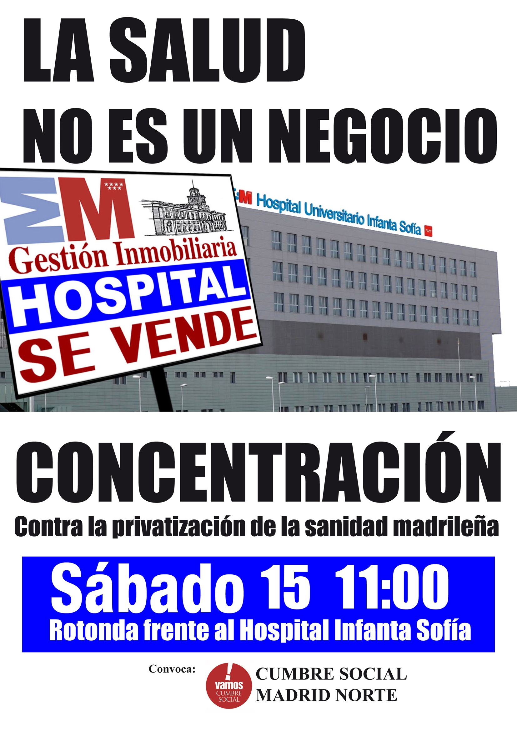 Rueda de prensa celebrada ayer en el Hospital Infanta Sofia de San Sebastián de los Reyes. En ella participan miembros de la Cumbre Social Madrid Norte, como Cristina Díez ( Secretaria General UGT- Madrid Norte), Román Sánchez ( Secretario General CCOO- Madrid norte), Partidos Políticos (Izquierda Unida Sanse, IU- Alcobendas, Agrupaciones de Cobeña y Torrelaguna,Izquierda Independiente PSOE) Asociaciones de lso dos municipios y representantes de la Plataforma en contra de la privatización de la Sanidad Madrileña y pacientes.