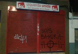 El local de Izquierda Unida en San Sebastián de los Reyes ha sido objeto de la agresión de un grupo de extrema derecha. La fachada de nuestra sede en la calle Travesía del Socorro ha sido pintada con una cruz céltica de grandes dimensiones, flanqueada por dos “H” (acrónimo de “Heil Hitler”) junto con la expresión ‘sois basura’ ayer martes a plena luz del día.