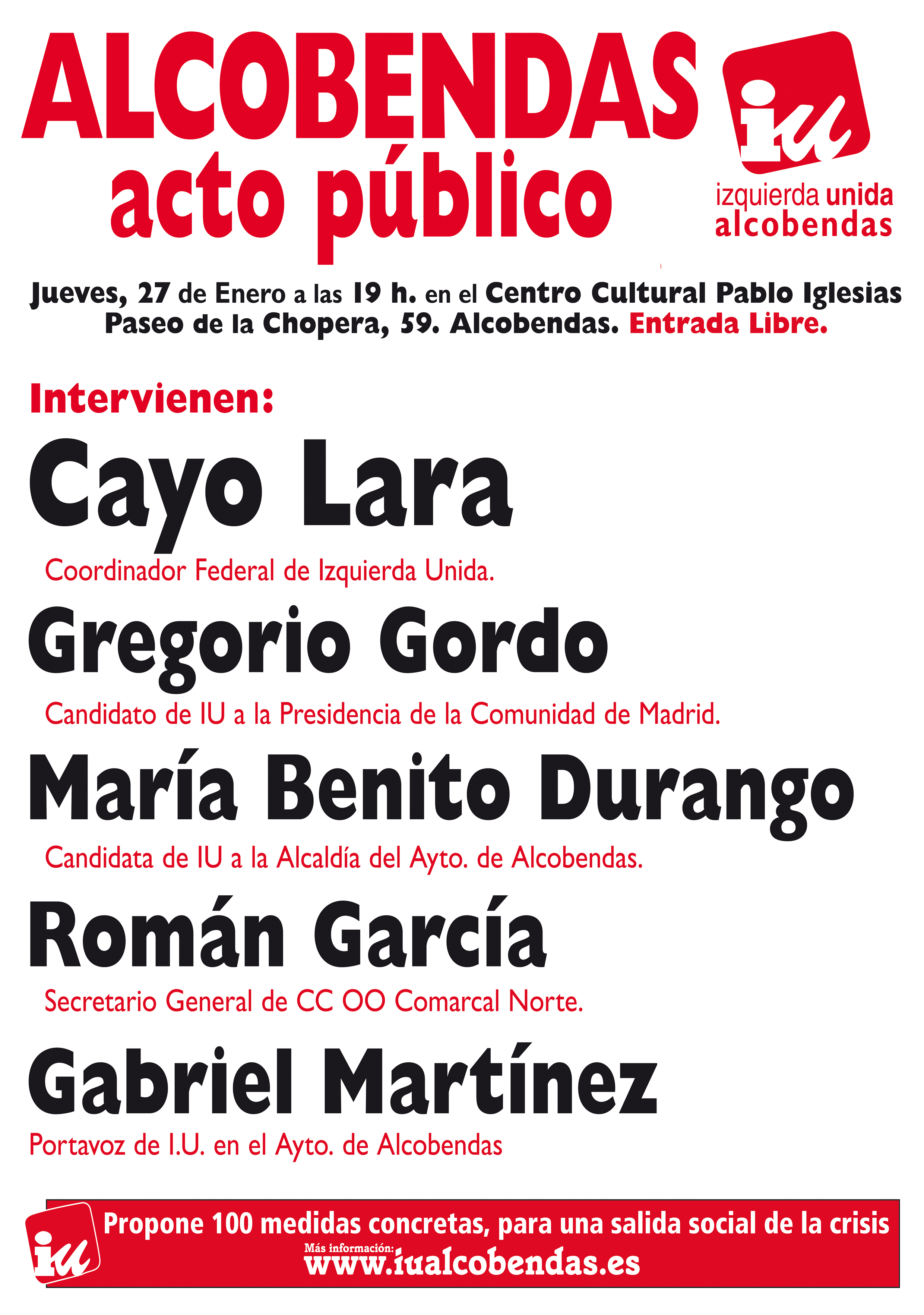 El coordinador general de Izquierda Unida, Cayo Lara, estará en Alcobendas el próximo JUEVES 27 de Enero, a las 19:00 horas en el Centro Cultural PABLO IGLESIAS. Intervienen: